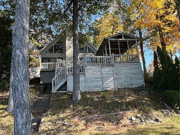 Spectacular A Frame style home ON THE WATER. Big Long Lake in Wolcottville IN. Detached Garage, Lake Front Home on Lot 174. East Side of the Lake. Awesome View across the Lake. Large Deck, with Covered and Screened Gazebo Area. Cozy Interior with Fireplace and LOTS of Glass for your view of Water and Fun. Detached 2 car Garage. Large Deck overlooking the Lake. First floor Master, GasLog burning Fireplace.