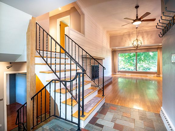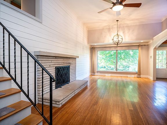 All brick mid-century modern home with 4 bedrooms and 2 full baths nestled on a gorgeous 0.6 acre lot just minutes from Peoria Heights, Junction City, and Rock Island Trail - Upon entering, you're greeted with gleaming hardwood floors and the fireplaced living room with soaring ceilings and windows - Beyond is the high-end kitchen that's a chef's dream boasting SS appliances; quartz and walnut countertops; Amish hickory custom cabinets, and bamboo flooring - There's even a unique piece of history with the ceiling showcasing boards from crates shipped back home to the original owner after WWII - The dining room provides extra storage with built-in cabinetry - The upper level features 3 bedrooms with large closets and hardwood floors and an updated bathroom with double vanities, tiled shower, and custom tile flooring - The walk-up attic could be finished or used for bonus storage - The lower level offers a 4th bedroom, laundry room with polished concrete floors and access to the attached garage - In the basement, you'll find the fireplaced family room with polished concrete floors, office/gym room, and a second updated full bath - Double patios overlook the huge, fenced backyard and oversized detached 2-stall garage - Don't forget to venture beyond the fence to the wooded play area - For the nature enthusiasts, the yard is adorned with native plantings creating a wildlife delight to enjoy come Spring - There's so much to appreciate and love about this home!