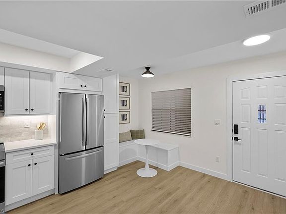 This condo has just been renovated and is like new - be the first to enjoy this great space. The kitchen has been opened up and has new quartz counters, stainless appliances, soft close cabinets and a custom breakfast nook. The entire unit was installed with deluxe easy care vinyl wood-look floors, and the bathrooms were upgraded with quartz countertops, new vanities, mirrors and faucets. All outlets and under sink plumbing in the unit were replaced and upgraded, and a brand new AC installed. With a southern exposure, the unit is light and bright, and the lanai overlooks the pool and golf course beyond. Tastefully furnished, with the second bedroom awaiting your decision to furnish as a bedroom, office or den. A few steps from the elevator to your door, and a covered reserved parking spot for you. 10-15 minutes from Olde Naples, the beaches, the Botanical Garden, and all the great shopping and dining in the area.