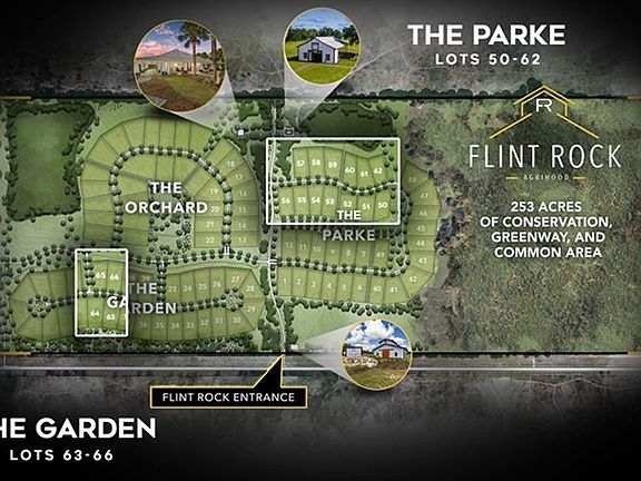 Lot 58 is a 1.06 acre lot that expands approximately 161 feet across its rear property line. Its west facing backyard abuts a designated common area. As Gainesville's first Agrihood, Flint Rock promotes a lifestyle of healthy living and wellness, carefully crafted to embrace the farm-to-table lifestyle. This luxury residential community is centered around its recreational spaces, nature trails, gardens, orchards and conservation preserve. With 2.5 miles of walking paths and beautiful expanses of land, residents will enjoy more green space than your average Gainesville subdivision. Aptly named The Parke, this gated subdivision enjoys magnificent private views of the 151 acre conservation easement, while offering direct access to miles of natural walking trails. Owners will have access to their Event Barn, a unique venue for hosting various outdoor activities. The Residents’ Farmhouse offers a catering kitchen with spacious indoor gathering areas, surrounded by a fire pit area for casual outdoor entertaining