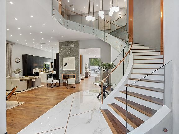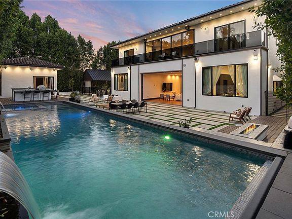 Tucked behind mature privacy hedges on an expansive nearly 18,000 sf lot, this gated, newer construction estate is ideally located south of the Boulevard in prime Tarzana. As you enter through the grand front door, you are greeted to a sprawling open floor plan highlighted by soaring ceilings that carry throughout the home. The sleek, modern chef’s kitchen is equipped with top-of-the-line Miele appliances, a walk-in pantry, massive waterfall island and sun-drenched breakfast nook. An oversized sliding glass door in the spacious family room disappears into the wall, allowing for a seamless flow between the indoor and outdoor living spaces. Completing the main level is a formal living and dining room designed for entertaining, ensuite bedroom, laundry room and bonus room. Ascend the elegantly curved staircase or take a ride in your personal elevator to the upper level, where you will find a large recreation room with direct access to the backyard and four generously sized ensuite bedrooms, each with its own walk-in closet and private balcony. The expansive primary suite features a private sitting room, custom walk-in closet and luxe ensuite bathroom, complete with a soaking tub, rainfall shower and double vanity. A floor-to-ceiling wall of glass floods the primary bedroom with natural light and a projection screen allows you to watch tv from bed. Surrounded by mature privacy hedges, the entertainer's backyard is a true oasis highlighted by a 50 ft heated pool/spa with a baja shelf and pool house that offers a kitchenette and bathroom. There's also a large cabana, outdoor kitchen with bar seating, built-in firepit, sports court and ample patio/yard space. Additional amenities include a smart home system with integrated speakers, robust security system, electric pool cover and three-car garage with oversized doors, a car lift and EV charger. Located down the street from Ventura Boulevard, enjoy easy access to excellent shopping, dining and entertainment options.