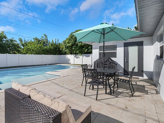 One-car garageHeated salt water poolThree bedroomsTwo bathroomsDining roomNew tile plank flooring