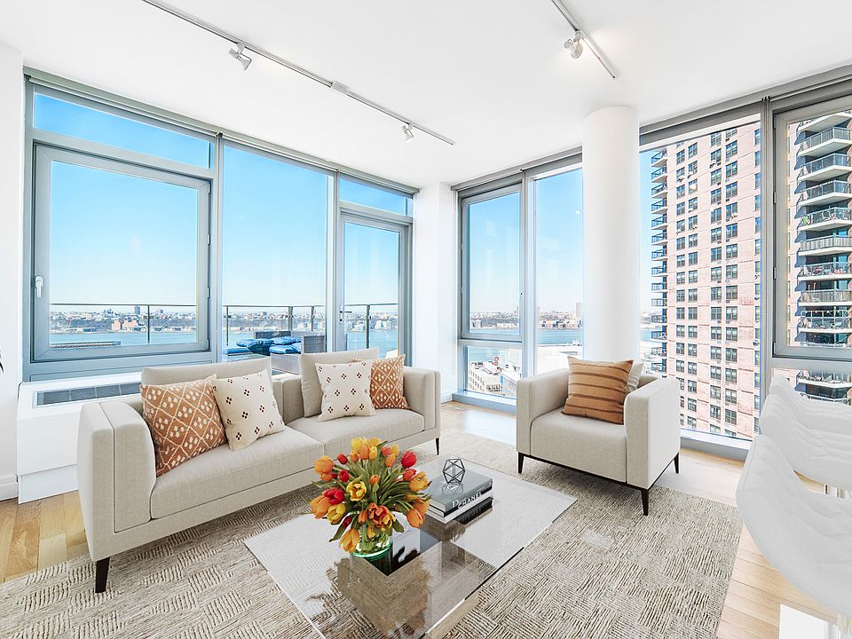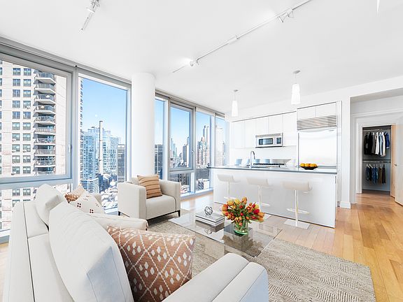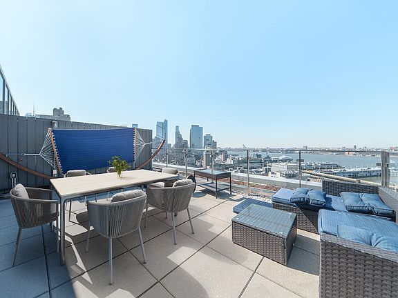 This stunning 2-bedroom, 2-bathroom apartment in Midtown West in New York City is the epitome of luxury living. As you enter, you are immediately struck by the luxurious finishes and modern design of the apartment. The apartment is elegantly designed with high-end finishes and top-of-the-line appliances. The spacious living room boasts floor-to-ceiling windows that offer breathtaking views of the city skyline and gorgeous water views of the Hudson River. Overlooking the river is your large private terrace, perfect for enjoying your morning coffee or hosting friends while taking in the stunning views of the city. The modern kitchen is a chef's dream, featuring premium stainless-steel appliances and marble countertops. The two bedrooms are equally impressive with two full bathrooms and ample closet space.