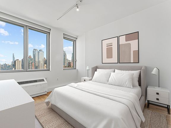 This stunning 2-bedroom, 2-bathroom apartment in Midtown West in New York City is the epitome of luxury living. As you enter, you are immediately struck by the luxurious finishes and modern design of the apartment. The apartment is elegantly designed with high-end finishes and top-of-the-line appliances. The modern kitchen is a chef's dream, featuring premium stainless-steel appliances and marble countertops. The spacious living room boasts breathtaking views of the city skyline. The two bedrooms are equally impressive with ample closet space, with the primary bedroom having an additional two spacious closets, and an extra-large hallway closet for additional storage.
