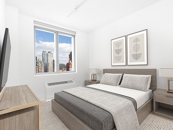 This stunning 2-bedroom, 2-bathroom apartment in Midtown West in New York City is the epitome of luxury living. As you enter, you are immediately struck by the luxurious finishes and modern design of the apartment. The apartment is elegantly designed with high-end finishes and top-of-the-line appliances. The modern kitchen is a chef's dream, featuring premium stainless-steel appliances and marble countertops. The spacious living room boasts breathtaking views of the city skyline. The two bedrooms are equally impressive with ample closet space, with the primary bedroom having an additional two spacious closets, and an extra-large hallway closet for additional storage.