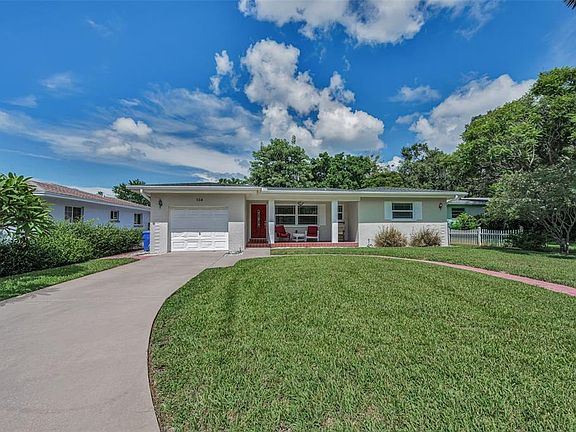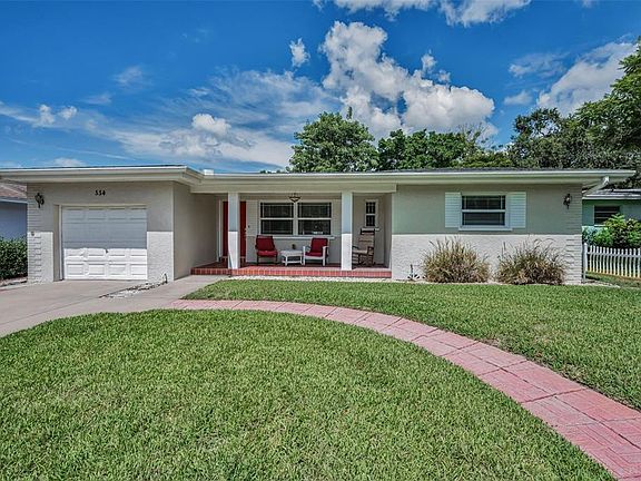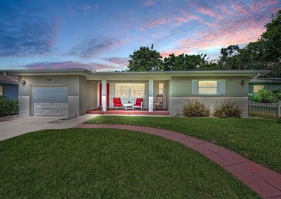 One or more photo(s) has been virtually staged. Welcome to your slice of paradise in the heart of Downtown Dunedin! This beautifully maintained 2-bedroom, 2-bathroom, 2,300 sqft home sits on an expansive ¼-acre lot just steps from the Pinellas Trail, TD Ballpark, vibrant local breweries, restaurants, and world-famous sunsets. Step beyond the lush, landscaped front yard to find a cozy, covered porch that’s perfect for enjoying your morning coffee. Inside, you’re welcomed by a spacious living room with original hardwood floors throughout and a large double-pane bay window that floods the space with natural light while offering serene views of the front yard. Continue into the the kitchen where its a delight for any home chef, featuring solid wood cabinets, Corian countertops, a new LG ThinQ stainless steel refrigerator, and a casual eat-in nook that overlooks the private backyard. A convenient pass-through door leads to an oversized one-car garage with soaring vaulted ceilings—ideal for storage, workshop, or a loft. Continue into the open Florida room, where newer windows and 10-foot ceilings invite in the bright Florida sunshine, offering flexible living space with panoramic views of the lush, fully fenced backyard designed for entertaining. Enjoy a large paved patio area, plenty of grassy areas for play, and room to add a pool. After a day of exploring downtown on the golf cart or biking along the trail, retreat to your spacious primary bedroom with your private ensuite bathroom complete with a new vanity. The second bedroom is equally generous in size and perfect for guests or a home office. The guest bathroom features a new vanity and soaking tub. Additional features include newer A/C (2019), newer double pane windows, an updated power panel and plumbing, newer irrigation, oversized Florida Room, and not in a flood zone. With all the modern updates and historic charm, this home is truly move-in ready. Grab your bike, boat, or golf cart and start living the laid-back Downtown Dunedin lifestyle today!