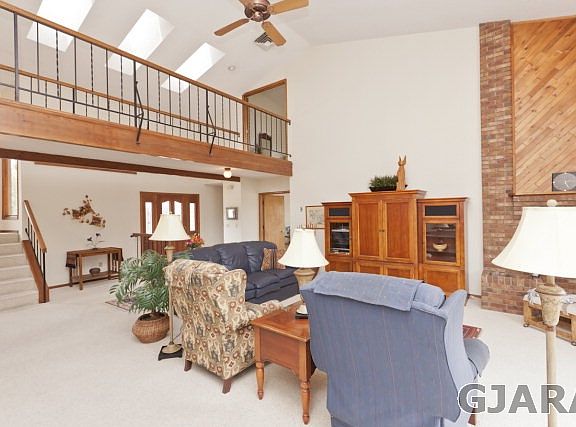 Wonderful, convenient location in a peaceful subdivision minutes from shopping, schools and hiking/walking trails and paths. This contemporary two story home has been well maintained and features a spacious living room with soaring, dramatic ceiling, corner fireplace and large windows. The adjoining den is private and cozy. Spacious kitchen has large breakfast nook and abundant cabinets and counter space. The large deck off the east side of the house is perfect for morning coffee or evening entertaining with Bookcliffs and city views. Upstairs are three bedrooms and two bathrooms.