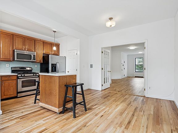 Discover the perfect blend of luxury and comfort in this large stunning 2 bedroom, 2.5 baths brownstone duplex. A serene escape awaits with a private garden and a sophisticated layout designed for modern living. The heart of the home is a meticulously designed eat-in kitchen, complete with French doors, granite countertops, a stylish backsplash, and a moveable central island. Stainless steel appliance including a microwave and dishwasher make cooking and entertaining a pleasure. The primary bedroom features a private en-suite bathroom, while the spacious second bedroom comfortably accommodates a king-sized bed. The home is bathed in natural light from large windows and enhanced by high ceilings, creating an airy and expansive atmosphere. This home also offers a private in-unit washer and dryer, a dedicated kitchen pantry, and ample basement storage. Step outside to enjoy a spacious private backyard and a bonus balcony, great for relaxing or al fresco dining. Heat and hot water are included in the rent for added convenience.