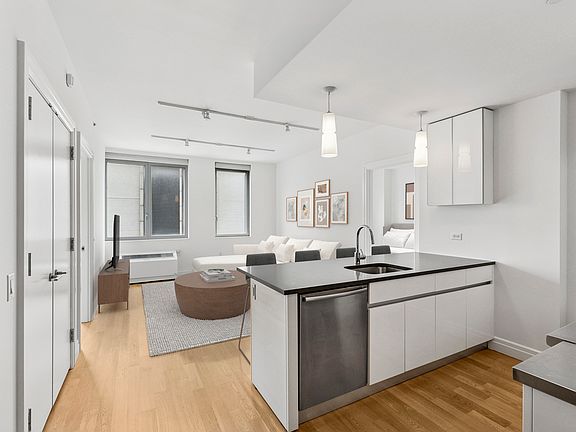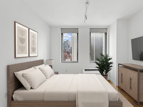 This stunning 2-bedroom, 1-bathroom apartment in Midtown West in New York City is the epitome of luxury living. As you enter, you are immediately struck by the luxurious finishes and modern design of the apartment. The apartment is elegantly designed with high-end finishes and top-of-the-line appliances. The modern kitchen is a chef's dream, featuring premium stainless-steel appliances and marble countertops. The spacious living room boasts breathtaking views of the city skyline. The two bedrooms are spacious and feature ample closet space. An impressively large bathroom offers a spa-like retreat with a deep-soaking tub, separate shower, and double vanity.