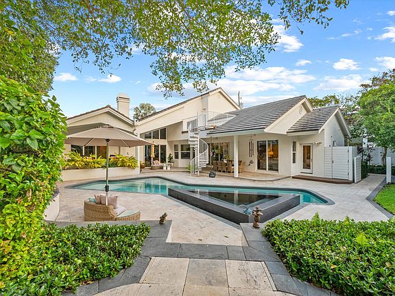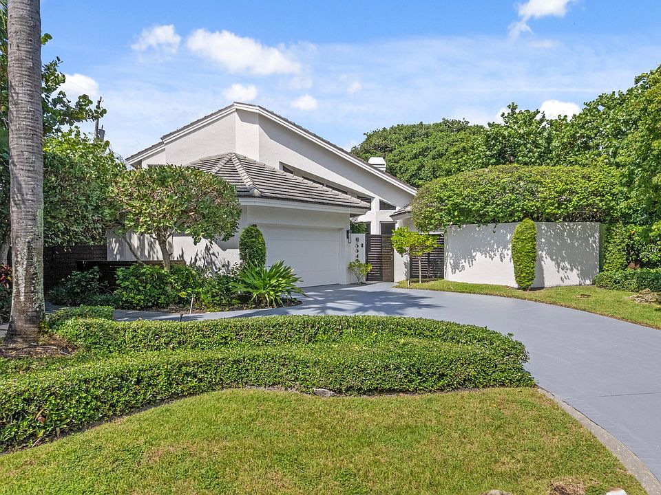 Exuding coastal sophistication, this lushly landscaped four-bedroom estate in prestigious Ocean Ridge combines modern elegance with timeless design. Dramatic vaulted ceilings, polished Saturnia floors, and a striking stone-mantel fireplace highlight the open living spaces, while walls of glass invite natural light and garden views. The expansive yard, surrounded by tropical landscaping with recent upgrades, creates a private oasis. Just four blocks from the beach, this storm-secure home features hurricane-impact windows and a generator, epitomizing refined coastal living.