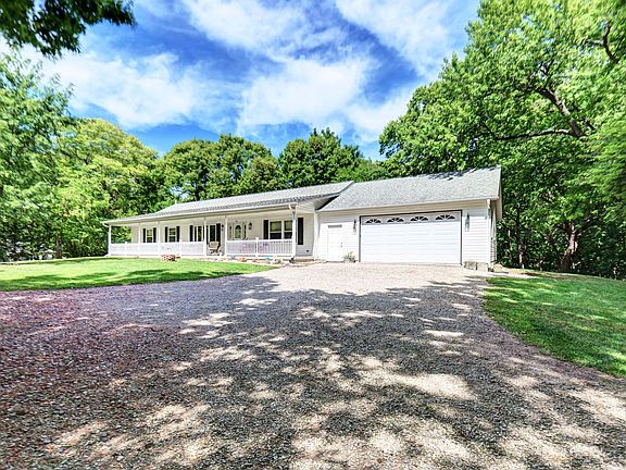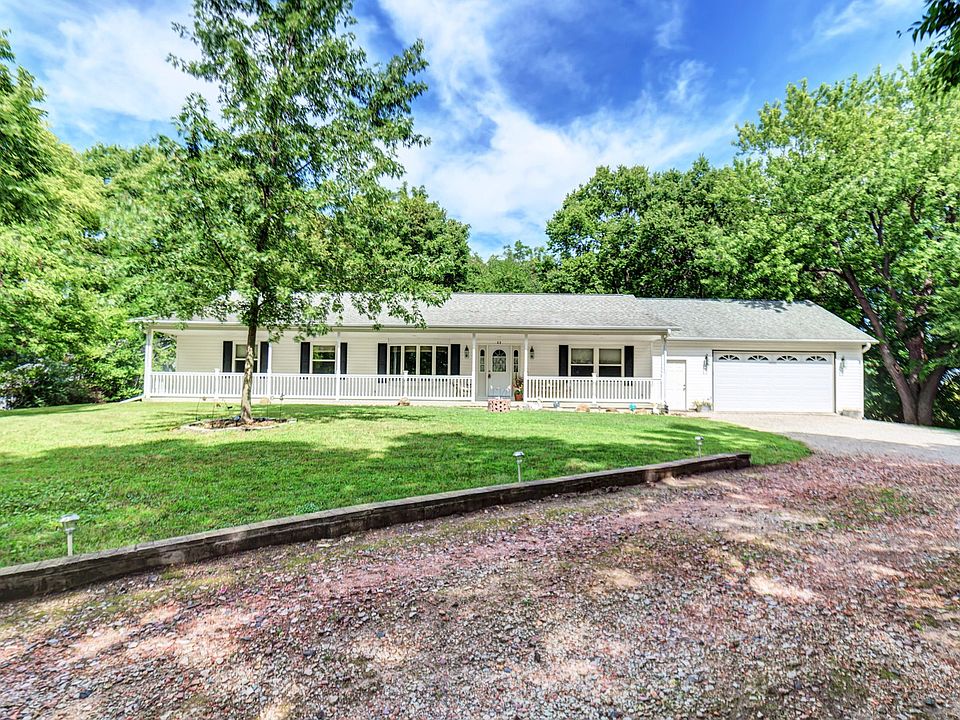 Uniquely situated 3 bedroom ranch with a full basement set back on a hill on over an acre. Spend the morning enjoying your coffee on this gorgeous front porch! This beautiful home has a large living room, 3 bedrooms, a den and walk in closets! Large master bedroom with a whirlpool tub and separate shower. Freshly cleaned carpet throughout. This large and open country kitchen boasts oak cabinets and corian counter tops, perfect for entertaining or just to enjoy every day. Beautiful 6 panel doors and a very nice laundry area. Plenty of privacy as this home sits up on a hill with many trees that provide privacy and nature at its best. The back yard is large and private. There is a shed in the back perfect for lawn equipment storage. Oversized two car garage and manicured landscaping. The basement is roughed in for a bathroom. Loads of room in the basement to make it into whatever you may want! This home is a low maintenance home with vinyl siding and tilt out windows and has been immaculately cared for. Water softener, and air conditioner unit recently replaced. This one wont last!