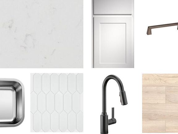The kitchen showcases 42'' upper white kitchen cabinets that give a modern aesthetic with gun metal cabinet hardware. The white Carrara Breeze quartz island adds a touch of luxury, while the white mosaic tile adds a classic touch.