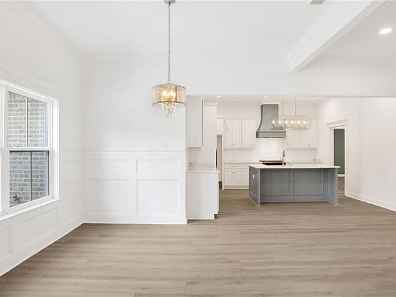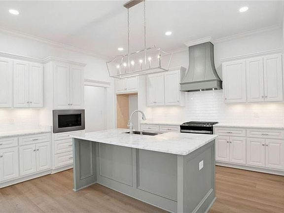 Spacious islandOrnate wainscottingFreestanding soaking tubDual vanitiesBright open layoutCustom cabinetryWhirlpool stainless appliances