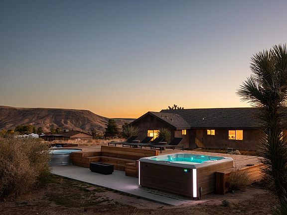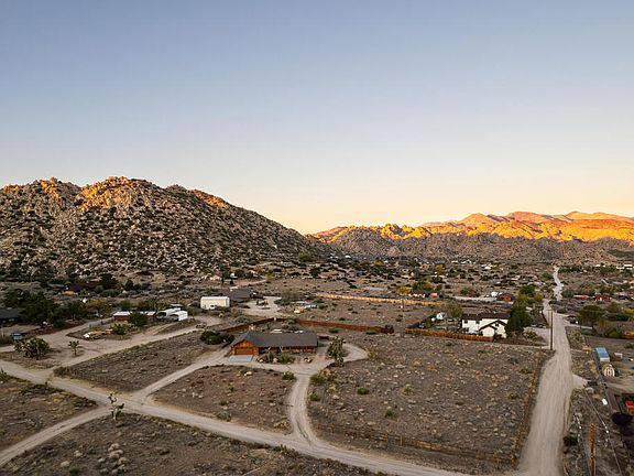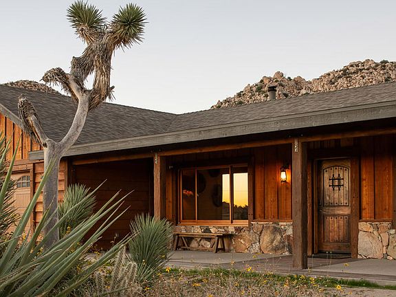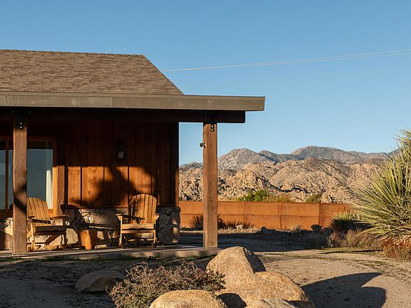 A private desert hideaway in Pioneertown set on just under 2.5 acres, offering wide open views, modern finishes, and a valuable second parcel for added space, privacy, or future potential.Designed with a refined blend of rustic and contemporary elements, the home features soaring wood ceilings, large windows that frame the surrounding mountains, and a spacious interior layout centered around a striking wood-burning fireplace. The kitchen includes elevated materials, custom wood cabinetry, and an easy flow into the dining and living areas, creating a comfortable setting for everyday living and gatherings.The home offers three generous bedrooms and three baths, including a well appointed primary suite with a walk in shower, dedicated vanity area, and a soaking tub oriented toward the desert landscape. A bright flex room adds a dedicated space for work, creativity, or quiet retreat, and the large garage provides ample storage or workshop potential.Outdoor areas include a wood deck, cowboy pool, spa, BBQ and dining area, and multiple lounge spaces for sunrise, sunset, and stargazing. The combined parcels create a rare sense of openness while still offering defined outdoor living spaces throughout the property.Located within walking distance to downtown Pioneertown, Red Dog, and Pappy and Harriet's, and a short drive to Joshua Tree National Park and the shops and restaurants of the High Desert.A standout desert property with modern construction, elevated materials, generous interior volume, and a valuable bonus parcel, ideal as a full time residence, private retreat, or an incredible opportunity to create a premium short term rental.