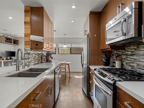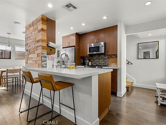 Discover this beautifully remodeled condo in the heart of the highly desirable Valley Village! Step inside to an inviting foyer with engineered wood flooring that leads into a bright, open-concept living space. High ceilings, recessed lighting, and a cozy gas fireplace create a stylish and welcoming atmosphere. The spacious dining area features a built-in buffet, ideal for hosting gatherings. Smart home upgrades include LED lighting, a 5-speaker home theater surround system, and a Nest thermostat. A thoughtfully placed half bath sits just behind the dining area. The galley-style kitchen impresses with stainless steel appliances, quartz countertops, abundant cabinet storage, a new dishwasher, and new fixtures that add a fresh, modern touch. Upstairs, you’ll find both bedrooms, two full bathrooms, and a convenient side-by-side laundry area. The primary suite is generously sized, complete with an elegant ensuite bathroom. New blackout blinds have been installed in the primary bedroom for added privacy and comfort. Additional highlights include central air & heat, copper plumbing, a new HVAC system, and Nest security cameras. The perks continue outside with two side-by-side subterranean parking spaces, an electric car charging station, and secure gated garage access with ample guest parking. Perfectly positioned near Trader Joe’s, Whole Foods, Gelson’s, Jon’s Supermarket, and Starbucks, with easy access to two farmers’ markets, Universal Studios (just 3 miles away), and the Hollywood Bowl (5 miles away). Plus, a top-rated elementary school is just a block away. Don’t miss this incredible opportunity—schedule your visit today!