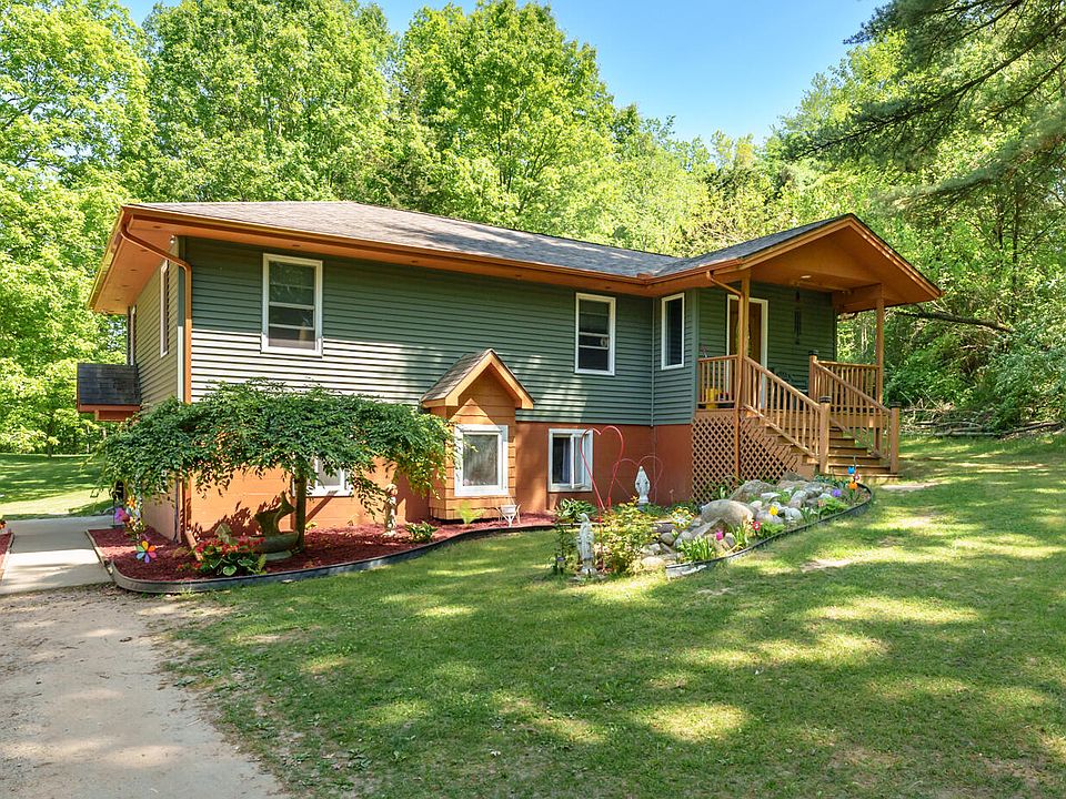 Welcome to this spacious 4 bedroom, 2 bath home, nestled in a private and serene 3 acre paradise! Large kitchen with walk-in pantry and breakfast bar will make cooking a joy! Dining area, two bedrooms, full bath, and living room with French glass doors leading out to a large deck complete the main floor. On the lower walkout level, you will enjoy the family room, 2, (possibly 3) bedrooms, full bath and laundry. All rooms are spacious! The walkout level features a side entry door that leads to the detached 18x24 building that could be used for office space, storage, or could be converted into a garage. Large private backyard surrounded by gorgeous tall trees. Nicley maintained home ready for new owners. Come take a look today, this one won't last long!