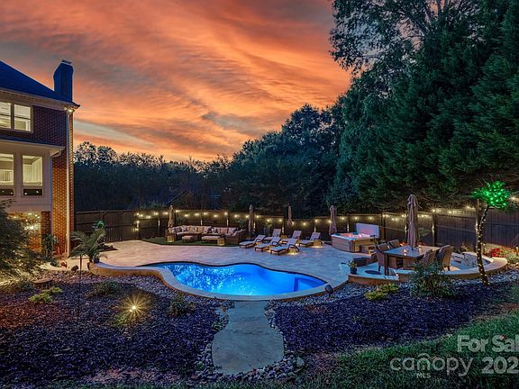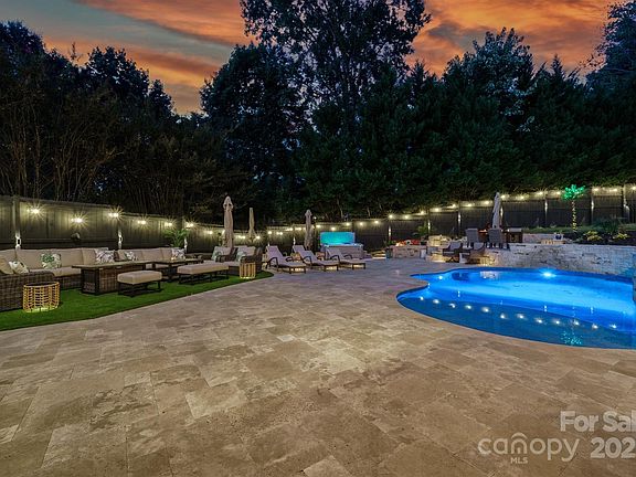 The backyard is your own private paradise, featuring a sparkling swimming pool, relaxing hot tub, and a brand-new wooden privacy fence, paired with wrought iron fencing to keep pets safe and critters out. Surround yourself with lush greenery, granite walkways, and a custom sail over the deck for shade and style. Enjoy evenings under the stars with automatic up-lighting in the front and back yards, plus a state-of-the-art outdoor Sonos surround system and Bose deck speakers. An outdoor TV ensures pool days and game nights are always unforgettable.