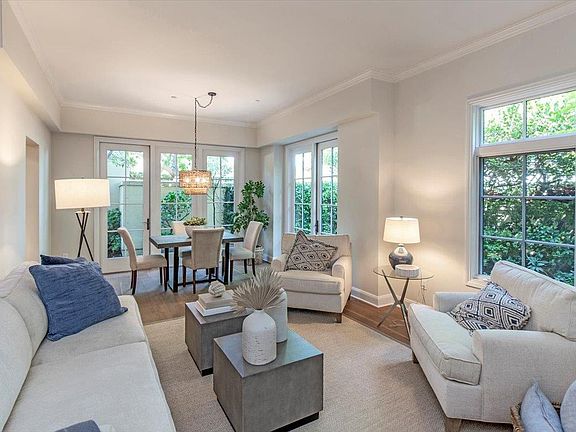 Wonderful location at The Hamilton- Palo Alto's luxury 55+ community in the heart of Downtown Palo Alto. In this corner unit every room overlooks a private wrap around garden featuring mature landscaping and multiple patio areas. It has three bedrooms and two full bathrooms, with ample storage space. Other features include: central air conditioning, new flooring, a gas fireplace and and french doors that open to patio space. Residents enjoy access to community facilities, including an indoor pool, and spa , 24 hour front desk, access to gourmet dinners served 5 days a week, gorgeous library, shared guest rooms for overnight visitors, access to a driver, and other planned activities. Dues shown are for one person, if two people, dues are higher. If residents are a fall risk they can wear an alert bracelet that will alert the 24 hour staff immediately.