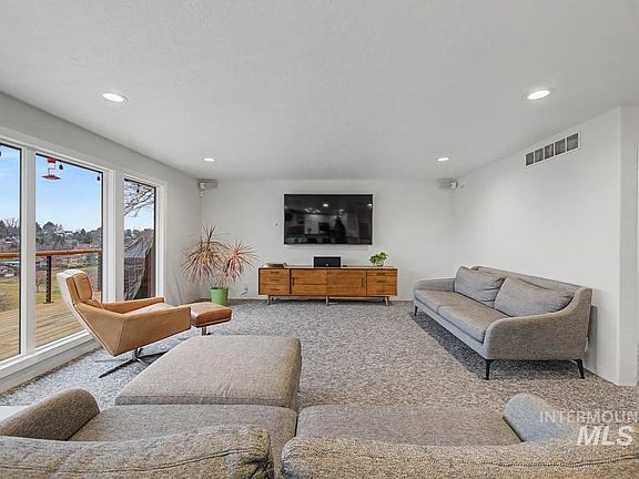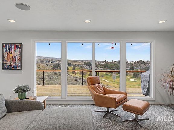 Welcome to the coveted Highlands of Boise, where breathtaking views of Crane Creek Golf Course and the surrounding foothills define this beautifully maintained single-level home with a walk-out basement. The main-level primary suite offers comfort and convenience, while the walk-out lower level features three additional bedrooms, a pocket office, and a spacious rec room—ideal for guests, hobbies, or multi-generational living. Designed for both everyday living and entertaining, the home offers multiple gathering spaces including a large great room with direct access to the expansive deck, a formal dining room that easily accommodates large dinner parties, and generous lower-level living space. The recently enhanced backyard features a substantial retaining wall creating rare, flat and usable yard space—hard to find in the foothills. Two storage sheds and new cedar-stained fencing complete the exterior improvements. Recent updates include upgraded lighting, updated plumbing and plumbing lines throughout, newer furnace, and tankless water heater. The garage features epoxy floors, built-in storage, and two EV chargers.