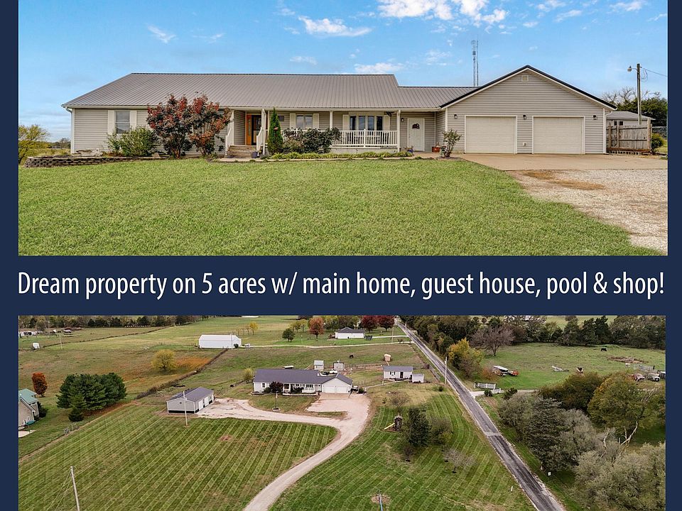 Who is looking for instant equity of $25,000 in the Rogersville School District? This 5-acre property offers exceptional versatility with a spacious 4-bedroom, 2.5-bath home, guest home, multiple outbuildings, and room for hobbies, work, and comfortable country living. The home appraised in October 2025 for $575,000, providing strong value and confidence for the next owner.The main home features updated LVP flooring and a brand-new HVAC system in 2025. The open living and dining areas flow into a bright kitchen with double wall ovens, a cooktop island, and a large walk-in pantry. The split-bedroom design includes two bedrooms with a shared bath and a generous primary suite, complete with soaking tub and walk-in closet. A fourth bedroom with an attached half bath serves well as an at-home office, guest room, or flexible-use space.In addition to the main home, the property includes a guest home or dedicated office/workspace, offering valuable separate living or work options. This space features an open layout with tin ceiling accents, a galley kitchen, full bath with laundry, a large bedroom, and a screened-in porch.Outdoor living at the main home includes a large deck, two pergolas, and an above-ground pool ideal for relaxing or entertaining. The acreage includes a newer 2450 workshop/outbuilding, storage shed, two chicken coops, a loafing shed, and multiple fruit trees out front.Located just minutes from Rogersville and Springfield, this property provides a peaceful setting with outstanding functionality, space, and value. Truly a must-see property -- rarely does a home like this come along in 417 Land!*Some photos have been virtually staged; as noted.