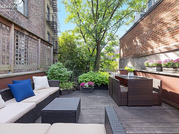 On the top floor, two well-proportioned bedrooms and a full bathroom open onto a lush, private terrace overlooking the garden, creating a serene, indoor-outdoor sanctuary rarely found in Manhattan. The basement level offers ample storage, another powder room, and a washer/dryer for added convenience.