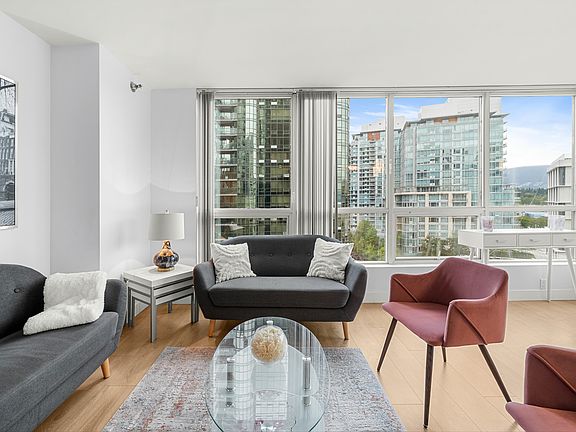 Welcome to Harbourside Park in Coal Harbour! This 589 sq. ft. furnished condo is cozy, charming, and equipped with everything you need for comfortable downtown living. The home features 1 bedroom + den, 1 bathroom, in-suite laundry, 1 parking stall, and 2 storage lockers. Residents enjoy access to outstanding amenities including an indoor pool, hot tub, fitness centre, meeting room, theatre, party rooms, and 24/7 security. Perfectly located just steps from the Seawall, Stanley Park, world-class dining, shopping, transit, and all that downtown Vancouver has to offer.