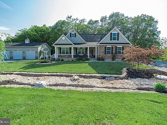 Gorgeous rancher on over 3 acres. The covered front porch leads you into this open concept home with spacious living room that offers cathedral ceilings, LVP floors. and opens to the amazing kitchen with large island, granite counters, and stainless steel appliances. The LVP floors run throughout the first floor. The large primary bedroom has cathedral ceilings and attached is the primary bathroom that has double sinks, tiled floor, separate soaking tub and tiled shower, and wow the large walk-in closet won't disappoint. The unfinished walk up basement is ready for your customized finishing touches. It has rough in plumbing for additional bathroom, active radon system, water softener w/uv light, battery operated back up sump pump. Enjoy nature watching from either the front or back porches which provide more space for outside entertaining as well with covered back porch that leads to the stamped patio. There is an outside shed to store your garden tools and lawn mower. The detached garage is a mechanics dream with all that space. It has its own separate 200 amp service, a half bath, and is climate controlled with a minisplit system. It has 4 garage doors (3 in front & 1 in back). There is also a 50 amp service for and RV hookup, and a whole house generator.