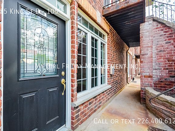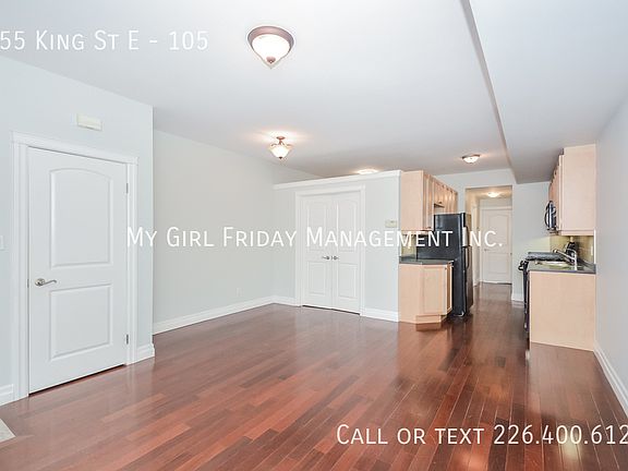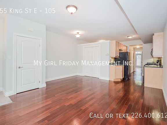 Experience refined urban living in Unit 105 at the distinguished Betzner Brownstones, perfectly positioned in Kitchener's vibrant Market District at 555 King Street East. Available in October, this executive one-bedroom residence offers an elegant blend of classic finishes and modern conveniences. Soaring ceilings and expansive, dressed windows bathe the open living space in natural light, while rich Brazilian cherry hardwood flows throughout the living areas. The gourmet kitchen is appointed with light oak cabinetry, ceramic tile flooring, a tasteful backsplash, double sink, abundant counter and storage space, and stainless appliances including a gas range, dishwasher, fridge and microwave. A convenient stackable washer/dryer and a front hall closet add functional luxury. The serene bedroom features a sizable closet, and the bathroom includes a tub/shower combination. One parking spot is included. Monthly rent: $2,150. Water and building maintenance are included; tenant is responsible for hydro and gas (to be set up in their name). Ideally located with easy access to amenities and the expressway, Unit 105 is an exceptional choice for those seeking a distinguished downtown residence.