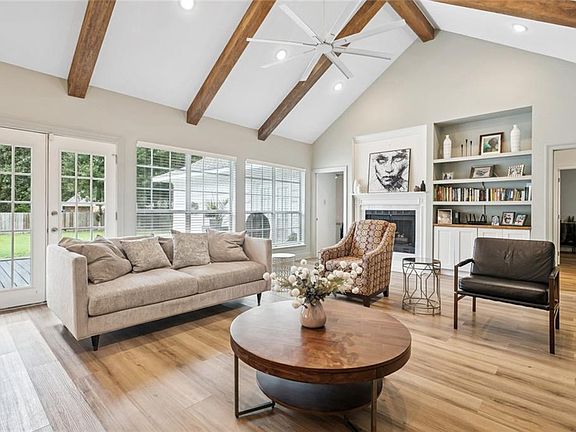Step into the spacious living area featuring elegant 2-inch forward blinds, a cozy gas fireplace, and built-ins for added storage. Plantation shutters throughout the rest of the home offer timeless style and privacy.