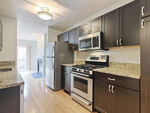 Experience bright light and warmth in this lovely maintained town home close to everything while having your own tranquil space with front views of the lush green grounds. Enjoy cooking in your dark cherry kitchen with granite countertops and stainless steel appliances in the open concept space with hardwood floors on the 1st floor. The dining and living area, with a walk out deck complete this floor. Head to the 2nd floor with brand new carpets throughout. This floor has 2 spacious bedrooms and 2 bathrooms with an attached master bath. Need a private home office? Head to the newly carpeted 3rd floor through the master bedroom into your HUGE room that can be used as a home office or playroom or TV Room - the possibilities are endless! Laundry is in the unfinished basement area. Park your car inside the 1 car garage which can be accessed via the basement. One additional parking spot outside the garage. Express bus stop outside, quick access to Rt 95 and Rt 93.