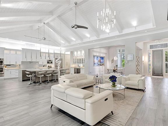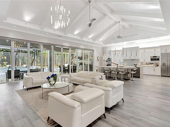 Welcome to 555 Mooring Line Drive, a stunning single-story estate home custom-designed for the ultimate coastal lifestyle. Nestled within the prestigious Moorings community, this 4-bedroom masterpiece spans over 4,200 sq. ft. and rests on a lushly landscaped lot, promising an unforgettable Florida getaway. A grand circular driveway sets the stage for your arrival. Step inside to discover sophisticated design and premium finishes throughout. The open-concept layout seamlessly blends the great room, dining area, and chef's kitchen under breathtaking 17-foot beamed ceilings. A striking wall of floor-to-ceiling glass doors connects the interior to an expansive outdoor living space, featuring a comfortable sitting area, fireplace, dining area, and outdoor kitchen. Enjoy the 42-foot heated pool with cascading waterfall features, a whirlpool spa, and a spacious sun deck. The primary suite offers private access to the pool and spa, along with a double walk-in shower, soaking tub, and extra-large walk-in closets. Each of the three ensuite bedrooms is thoughtfully furnished: one features a queen bed with full-size bunk beds, while the others are outfitted with king beds. Additionally, a spacious office adds versatility, making it ideal for working remotely or catching up on emails. Located just minutes from Naples' world-class beaches, this smart home is not only a sanctuary but also a rare find in one of Naples' most sought-after neighborhoods. A short drive away, discover the vibrancy of Downtown Naples' 5th Avenue South, where exceptional dining, live music, theater, art fairs, car shows, galleries, and upscale shopping await.