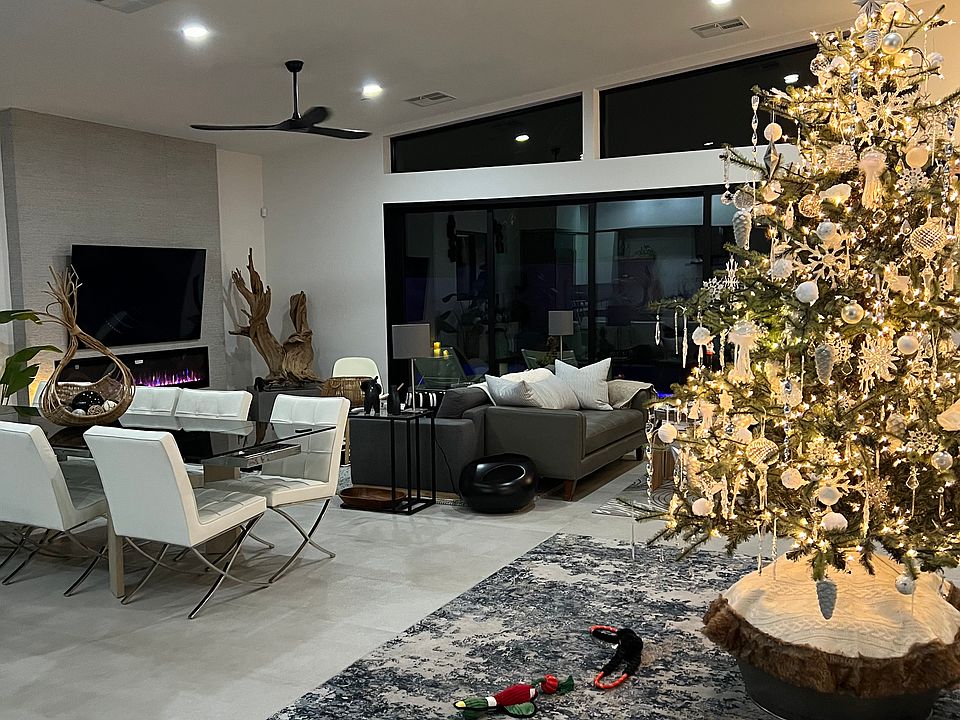 The true custom kitchen is a showstopper, featuring Dacor appliances, sleek cabinetry, & a spacious waterfall island-a striking centerpiece for this contemporary home. Designed for effortless elegance, the open floor plan boasts high ceilings, 2 linear fireplaces, & an abundance of natural light. Large-format block-like porcelain tile flooring enhances the home's clean, modern aesthetic. All 3 bedroom have king size beds and Samsung 4k TV, each is a private ensuite with custom-designed walk-in closets.