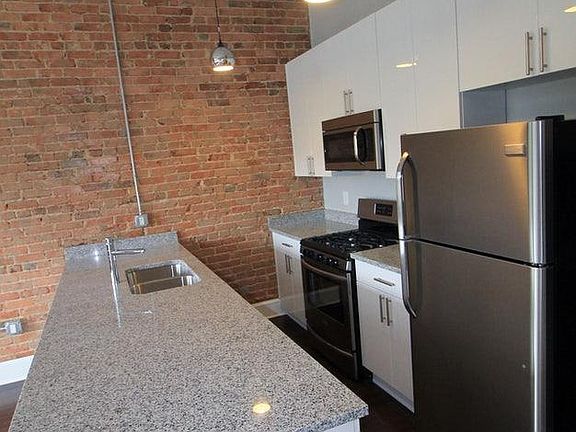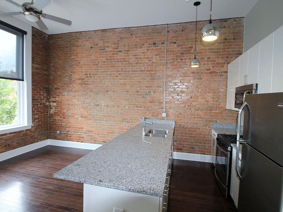 Exposed brickLarge windowsStainless steel appliancesGas cookingGranite countertopsCustom tile showers