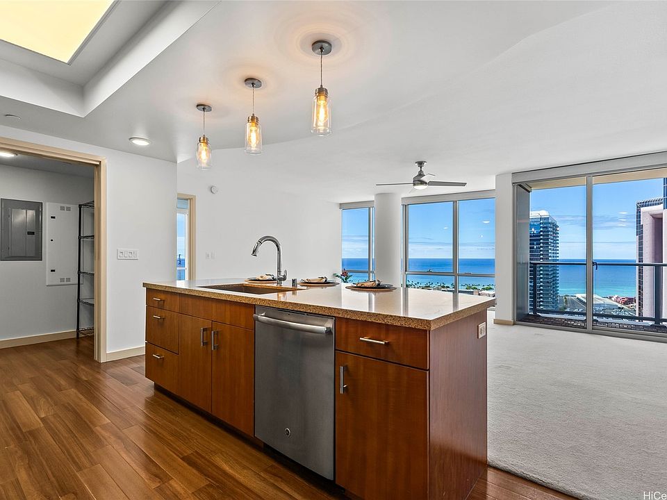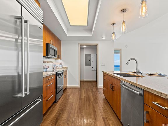 Must See! Fall in love with breathtaking Ocean, Harbor & City views from this beautifully designed 3BD/2BA/2PK ocean-facing corner end unit at Keauhou Place, perfectly situated in the heart of vibrant, modern Kaka‘ako. Wake up to morning coffee on your lanai and unwind as the sun sets through expansive floor-to-ceiling windows. The sleek modern kitchen with Sub-Zero refrigerator, quartz countertops & stainless steel appliances is ideal for both everyday living and entertaining. A spacious layout with walk-in closet, dual vanities & full-size washer/dryer, plus two side-by-side parking stalls, bring ease and comfort to daily life. Resort-style amenities include pool, BBQ pavilions, fitness. Steps from SALT at Our Kaka‘ako, H-Mart, Down to Earth, cafés & dining, and just minutes to Ala Moana & the beach. Offered at an attractive price below assessed value—your opportunity to own in Honolulu’s most dynamic neighborhood.