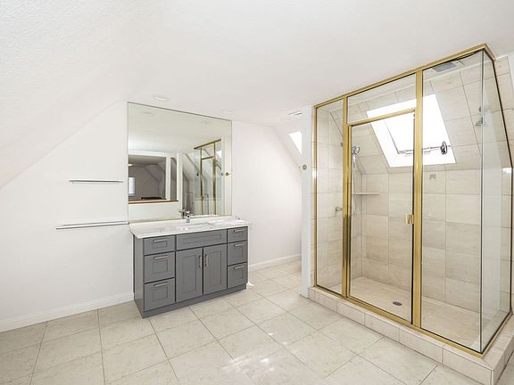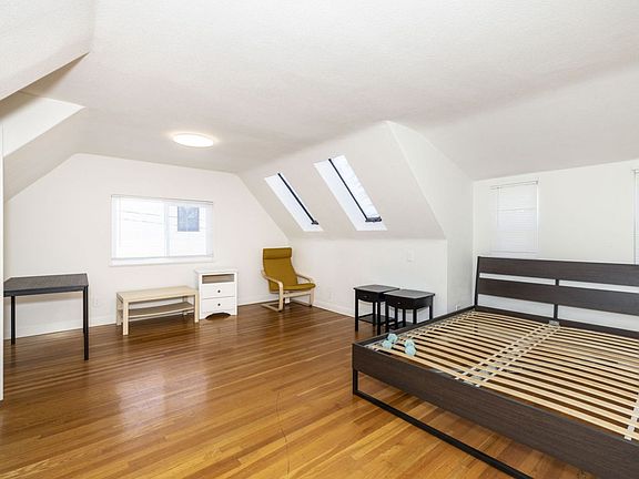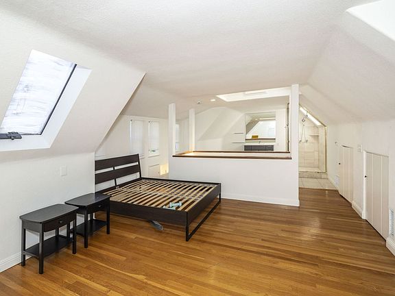 One loft style bedroom and bathroom located on second floor, with skylights allowing in tons of natural light