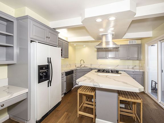 Remodeled kitchen has plenty of counter and cabinet space, plus gas range and island seating for 4