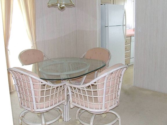 POPULAR MODEL AND LAYOUT- NICE LOT-SUNNY VINYL ENCLOSED SIDE PORCH WITH 3 WALLS OF WINDOWS AND AN 8X10 SHED FOR STORAGE!!! This charming home has a walk-through kitchen from the dining room and living room. Ample cabinets, corner sink with 3 windows above, stove top and wall oven, along with a kitchen nook with 3 more windows. Let the sun shine in! The dining room and living room are open to each other with 4 windows and a ceiling fan between the two. French doors in the living room lead to the side enclosed porch. An access door leads you to the front yard. A wide hallway features a linen closet. The guest bedroom has 1 window and a large closet with sliding glass doors. The guest bath across the hall has a tub/shower combination, corner vanity, hi rise commode, linen closet and a skylight. The master suite features a double walk-in closet, 2 windows, and a ceiling fan. The bath has a corner vanity, walk-in shower, high-rise commode, and two windows. READY TO BE MOVED INTO ... COME JOIN US IN PARADISE!!