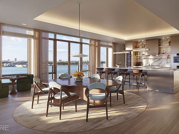 Residence Penthouse 23 is 6,267 square feet, featuring four bedrooms, four bathrooms, a powder room, and two private terraces totaling 1,357 square feet. The expansive, open-plan living and dining areas showcase sweeping views of the Hudson River and the New York City skyline through floor-to-ceiling windows, with north, south, east, and west exposures flooding the home with natural light. A statement fireplace and wet bar anchor the entertaining spaces, while the windowed eat-in kitchen, featuring a custom Olson Kundig–designed Jackbox, offers a warm, modern aesthetic with rich wood flooring throughout.
