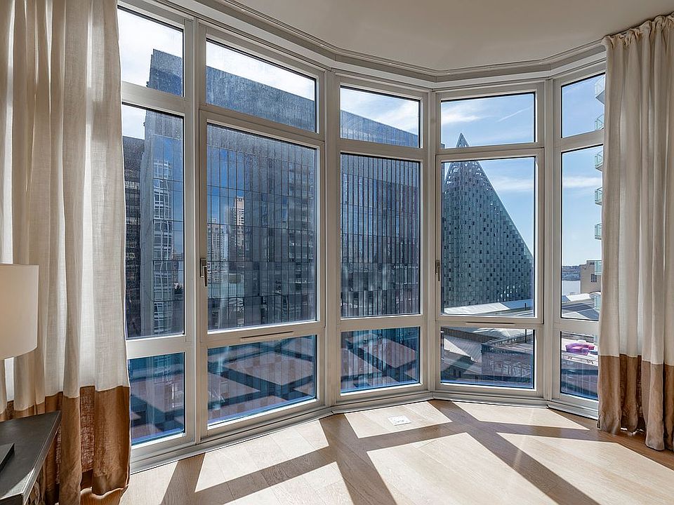The bathroom features limestone floors, marble countertops, walnut vanity and medicine cabinet, and fittings by Dornbracht. The apartment has 9'6" ceilings, wide white oak floors, in-unit washer and dryer, and a vertical heating and air-conditioning system that provides for unobstructed floor-to-ceiling views and abundant light.