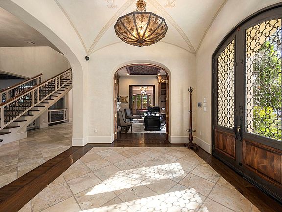 Opulent lookFull outdoor kitchenHigh ceilingsExpansive roomsRenaissance-era designTravertine and wood flrsBarrel ceiling