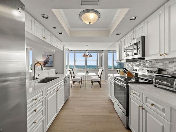 Welcome to breathtaking sunsets and panoramic views of Clam Bay, the Gulf of America, and a protected nature preserve from this beautifully updated 9th-floor corner unit in the prestigious St. Nicole building in Pelican Bay. This light-filled 3-bedroom, 2-bath condominium offers an open floor plan designed to maximize natural light and water views from every main living area. The newly updated kitchen boasts recently refaced cabinets, new quartz countertops, appliances, and contemporary hardware. Both bathrooms have been thoughtfully upgraded to match, featuring refaced cabinetry, quartz counters, and stylish finishes. New luxury vinyl plank flooring runs seamlessly throughout the home. The generously sized master bedroom features his and hers walk-in closets and a meticulously updated en suite master bath with a dual vanity and walk-in shower. Step out onto your expansive wrap-around lanai—offering both screened and open-air spaces—to soak in the Gulf breeze and serene views. With direct access from both the spacious master suite and living room, you’ll enjoy seamless indoor-outdoor living that captures the essence of the Naples lifestyle. St. Nicole offers an array of amenities, including a pool and spa that are currently nearing completion of a full renovation, two guest suites, a fitness center, card and billiards rooms, an on-site manager, and a welcoming front desk staff. Even more exciting—the lobby and community room are set to be completely redesigned, further elevating the appeal and value of this already exceptional building. Pelican Bay offers an unmatched resort-style lifestyle, with nearly three miles of private, white-sand beaches accessible via scenic boardwalks and tram service, two beachfront restaurants with full bar and chair service, and a wide array of outdoor activities including kayaking, paddleboarding, and sailing. Residents enjoy 18 Har-Tru tennis courts, a rapidly expanding pickleball complex, state-of-the-art fitness centers, wellness programming, and miles of walking and biking trails through 88 acres of protected preserve. Social and cultural amenities abound with nearby Artis–Naples and Waterside Shops, while optional membership at Club Pelican Bay provides access to a 27-hole championship golf course and private clubhouse. The recently completed Milestone Inspection passed with no Phase 2 required, giving you peace of mind from day one. Offered turnkey furnished, this residence is move-in ready—just bring your toothbrush and start enjoying the Pelican Bay lifestyle. Priced to sell, this exceptional opportunity won’t last. Schedule your private showing today!