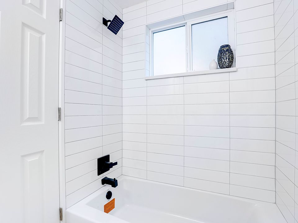 - Spacious bathroom featuring a walk-in shower, subway tile, and fixtures