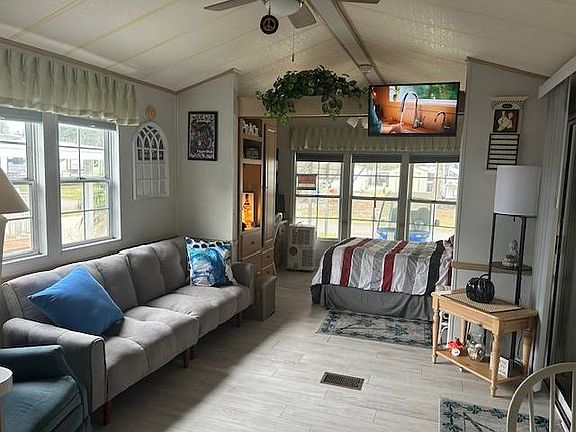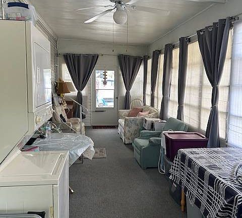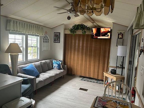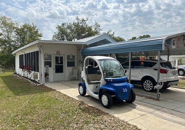 55+/LOT.RENT.$617/960.SQFT/2BED1BATH/GOLFCARTINCLUDED/SCREENED.IN.PATIO/BACKLOT Enjoy comfortable and convenient living! Located in the Red Oak RV Park, a vibrant 55+ community. This residence is perfect for seasonal getaways or year-round living in a friendly and active neighborhood. Step inside to an inviting open-concept living space, featuring modern, light-colored laminate flooring that extends throughout the main areas. The updated kitchen is both stylish and functional with freshly painted grey cabinets, offering ample storage. The home includes a convenient in-unit stackable washer and dryer. This home has two comfortable bedrooms. The primary bedroom is a peaceful retreat, while the second bedroom is versatile with a built-in wardrobe and desk, making it an ideal space for a home office or hobby room. Relax and enjoy the beautiful weather in the spacious screened-in lanai, perfect for entertaining guests or simply unwinding. The property also includes a covered carport, providing protection for your vehicle. A golf cart, also pictured, is a popular way to navigate the community. Community & Amenities: Red Oaks RV Park offers resort-style living in a pet-friendly setting. Residents enjoy three swimming pools, two dog parks, a wood shop, and multiple laundromats throughout the park. The community hosts weekly bingo games, numerous card games, crafts, and live entertainment-held across three on-site halls-creating a fun and social atmosphere. The lot rent is $659 per month, which includes cable, lawn care, and trash service. Additional amenities include a fitness center, hot tub, clubhouse, pavilion with planned activities, and outdoor fun like shuffleboard, horseshoes, biking, and hiking trails. Convenient laundry and mail services, restrooms, and optional storage are also available. Located near local shops, restaurants, and recreation, Red Oaks RV Park is the perfect place to call home. Don't miss your chance-schedule a viewing today!
