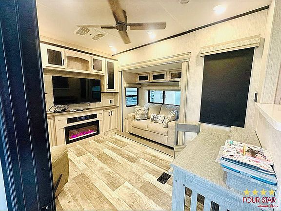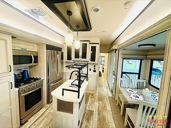 Gorgeous fifth wheel with newly installed covered deck, ramp and carport. All set up and ready to start enjoying your retirement years. 5 slide-outs make this unit very spacious. Lots of great windows to enjoy natural lighting. Beautiful island kitchen with large capacity SS refrigerator and gas range. Low maintenance and easy to clean. Fully furnished and ready to move in. Call for a virtual or private tour today!