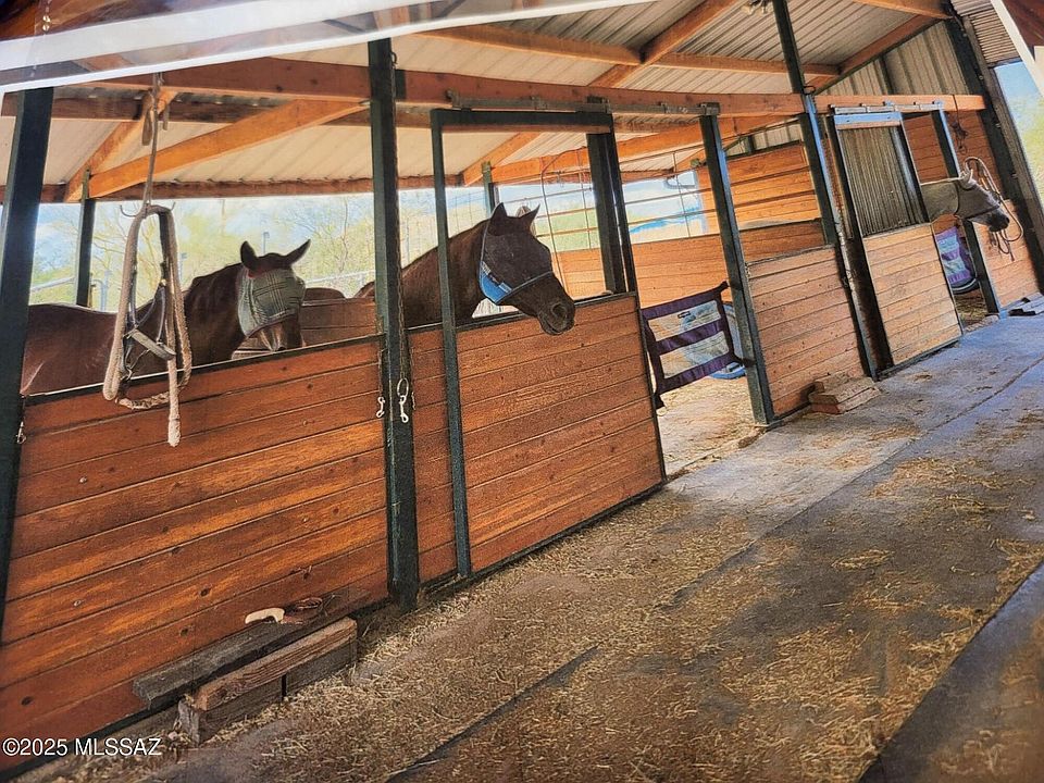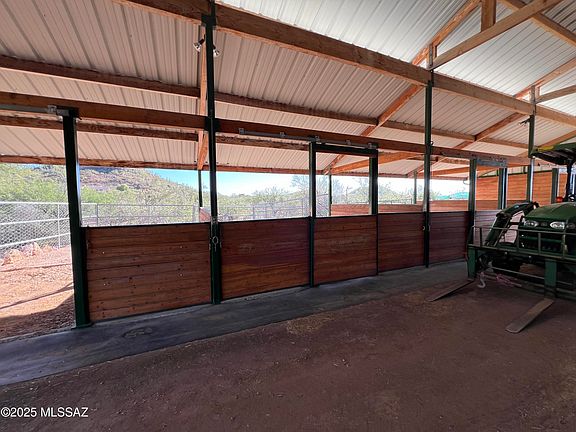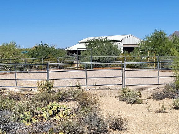 Experience wide-open living on over 5 acres in a stunning Sonoran Desert setting. This exceptional horse property features a well-designed barn with a spacious center aisle, four stalls with sliding doors and attached runs, ample hay storage, a 12'x14' tack room, wash rack, and roll-up door access at both ends for easy flow. Enjoy a 60' round pen with gated access to turnouts for training & exercise. A second barn--with front and rear access, offers abundant space for equipment storage, a workshop, or a place for your RV & other toys. A chicken coop and vegetable garden rounds out this incredible property that provides true rural living with room to roam. Surrounded by sweeping desert and mountain views, this property blends functionality with serene Arizona ranch-style living. Owned Solar for low Electric bills! Cozy wood burning fireplace in Great Room is also stubbed out for gas. Water harvesting with three 420 gallon tanks at the rear patio and a 1200 gallon cistern near the barn. 2" PVC water lines from the meter to the property. Plenty of room for trailer parking and miles of riding available in some of the most beautiful scenery in southern Arizona. Close to shopping and amenities, but far enough away to give you that feeling of peace and serenity. Bring your horses and enjoy all that this amazing property has to offer!