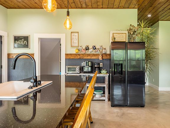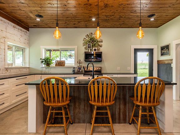 Own a 1.5 year new construction Shouse home! Quality build custom construction 40x80. Farm house style meets Industrial for a modernized steel approach to living. You're going to love the open space upon entry. Tall 9ft ceilings, expansive living with corian counters and farmhouse style sink, high end plumbing fixtures, sealed concrete floors, triple hanger walk in closets, music sound system in main floor bathroom, oversized walk-in shower w/ double heads in primary bath. Entire home is built for accessibility from showers to counters. Deep kitchen custom cabinets, industrial style fixtures & oversized macro ceiling fans in each room. Large patio to enjoy the wildlife. Settled next to crop ground the movement of deer & turkey is great! Partly wooded lot yet income grass opportunity with cattle chutes, fencing, watering systems and more on 9 acres m/l.