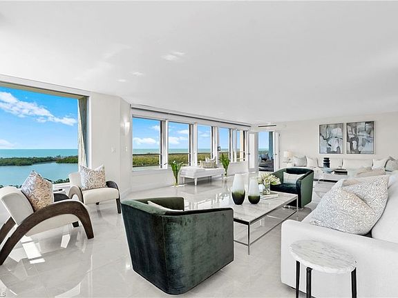 Experience the pinnacle of coastal living in this stunning, chic 2-bedroom, 2.5-bath condo located in The Heron at Pelican Bay. Offering panoramic Gulf and Bay views, this residence is the ultimate retreat for those who crave breathtaking sunsets and unparalleled luxury. Extensively renovated in 2019, it boasts a modern, sophisticated aesthetic with sleek, high-gloss European-style cabinetry, quartz countertops, Bosch appliances, and a central island perfect for casual dining. The contemporary kitchen is complemented by a subway tile backsplash, while oversized porcelain tile flooring and a soft white color palette create a sense of calm and elegance throughout the home. The floor-to-ceiling windows flood the space with natural light and provide an ever-changing masterpiece of water views, making this home a true showstopper. Whether you're hosting guests or enjoying a quiet evening, this condo offers the perfect backdrop for any occasion. Situated in the boutique, pet-friendly building of The Heron—known for its iconic architectural style—this residence offers exclusivity with only 40 units. Building amenities include two guest suites, on-site management, a resort-style pool and spa, and a private gym. In addition to this luxurious living space, you'll enjoy access to Pelican Bay’s world-class amenities, including two private beach pavilions with restaurants, miles of walking paths, tennis courts, pickleball, and endless fitness and wellness activities. You’ll also be just moments away from cultural experiences at Artis-Naples and the luxury shopping and dining at Waterside Shops and Mercato. Don’t miss this opportunity to embrace top-tier living in one of Naples’ most sought-after communities!