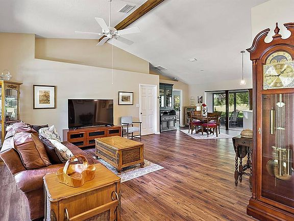 3/2 BLOCK HOME on .32 acre CORNER LOT with NO REAR NEIGHBORS and VIEWS of Golf Course Hole #2 in the GUARD GATED community of The Grove at Harbor Hills! UPDATES include NEW ROOF (2021), NEW STAINLESS STEEL APPLIANCES, NEW CAMBRIA QUARTZ COUNTERTOPS, NEW GUTTERS all around home, UPDATED LIGHT FIXTURES, FRESH EPOXY GARAGE FLOOR, FRESH INTERIOR and EXTERIOR PAINT, UPDATED DOUBLE VANITY with MAPLE SOFT CLOSE CABINETS, NEW SINKS, and NEW MIRRORS in Master Bathroom, NEW Pantry door with DEEP SHELVING in Kitchen, NEW WOOD BEAM in Living Room. Split floor plan with NEW wood look laminate flooring throughout home (NO CARPET), SOFT CLOSE cabinet doors and drawers in kitchen, INSIDE laundry room, and VAULTED ceilings. WALK-IN CLOSET in master bedroom, WALK-IN GLASS shower in master bathroom, along with LARGE linen closet. Both guest bedrooms have large closets and guest bathroom has tub/shower combo and a raised vanity. OVERSIZED TWO CAR GARAGE with a SIDE ENTRY GOLF CART GARAGE. Glass sliding doors from dining room take you out to the SCREENED-IN LANAI for views of backyard and golf course, along with an OPEN PATIO area. Sit back, relax and watch the golfers and wildlife from your backyard. Septic tank pumped in 2021, Irrigation system tuned up in 2021, Water Heater replaced in 2018. Click on Virtual Tour for a Video Walk Through!