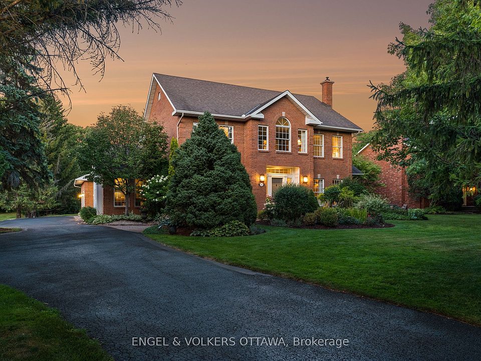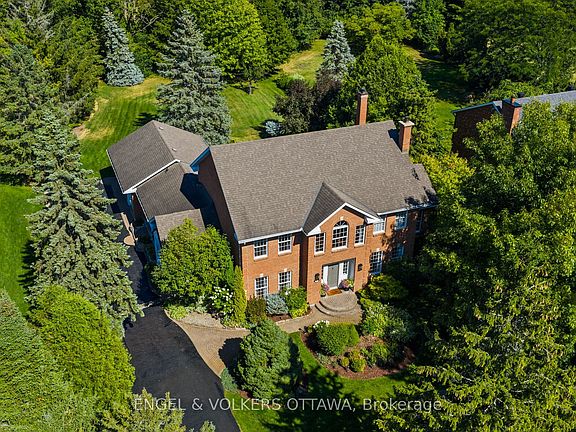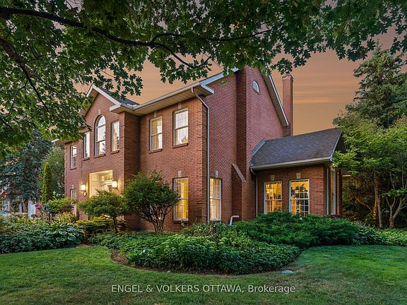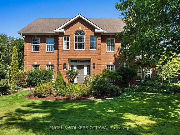 Poised on a serene ravine lot within the prestigious enclave of Manotick Estates, this beautiful Georgian-inspired all-brick residence embodies distinguished architectural character and timeless elegance. Upon entry, elevated ceiling heights, custom millwork, and a gracefully crafted hardwood staircase create an immediate sense of sophistication. The traditional cross-hall plan reveals a formal living room with soaring windows and an elegant gas fireplace, complemented by a grand dining room ideal for entertaining. At the heart of the home, the open-concept kitchen showcases bespoke Cabico cabinetry, quartz countertops, and premium stainless steel appliances. The adjoining breakfast area flows seamlessly into a warm and inviting family room, anchored by a handcrafted brick wood-burning fireplace of exceptional character. Extending from this space, a spectacular sunroom wrapped in floor-to-ceiling windows offers panoramic views of the landscaped grounds and private ravine setting. Thoughtfully designed, the layout also includes a charming side entrance with a covered porch, leading into a well-appointed mudroom and laundry area, along with a versatile office that could easily serve as a main floor bedroom. The home's upper storey is graced with an elegant and spacious primary suite, featuring a stunning ensuite with dual custom walnut vanities, a travertine glass shower, deep soaker tub, and heated flooring. Three additional bedrooms, each generously scaled and filled with natural light, share access to a beautifully appointed bathroom. The meticulously finished lower level presents a cozy family room with a striking feature brick wall, versatile flex rooms ideal for a gym or recreation space, abundant storage, and convenient direct access to the garage. Outdoors, the enchanting backyard evokes the charm of an English garden, with a serene courtyard, water features, and sweeping views of the private ravine lot, a perfect setting for future poolside living.