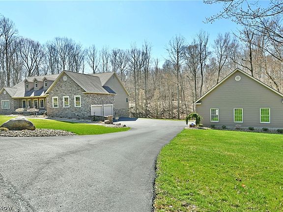A visual masterclass from top to bottom, this incredible Poland Township estate on 2.21 acres will blow you away with its must-see style and craftsmanship! The expansive layout features over 5700sq feet of finished living space including an outstanding lower level that’s perfect for entertaining. Get ready to enjoy the summer from the crowd favorite, elevated rear sunroom with breathtaking views that look out over the winding creek bed below. From beneath, the lower level walkout combines with additional patio space to the fenced-in backyard. Instantly captivating with its lavish stonework and pillar-lined porch, the home exudes curb appeal personification. The winding blacktop drive swings past an additional detached two-car garage, bringing the total to four. Through the grand entryway, a sun-washed foyer showcases its oversized tile flooring as it transcends immediate home office space. Towering ceilings rise above the breathtaking central great room where the window-lined rear wall besets the sunroom entrance. Formal dining stretches out alongside the wrap-around nearby kitchen island with seating for 10+, delighting with granite countertops and custom cherry-colored cabinetry, all accented by bright stainless appliances and hanging hooded range. The prominent dual stone fireplace continues through the oversized living room. Fall in love with the spacious master suite to include a walk-in closet and an opulent full bath with its glass stall shower and soaking tub. First-floor laundry room is located around the corner. On the opposite side of the home, the three remaining bedrooms are nicely sized, offer great closet space, and join an equally impressive full bath. Downstairs, a large open rec room offers a full bar with great views. You will also find a bonus room, storage room, and a newly finished third full bath. Updates include: whole house Generac Generator Dec 2022, two new HWT 2022, landscaping 2022, all new carpet 2022, and more plus a 1yr home warranty!